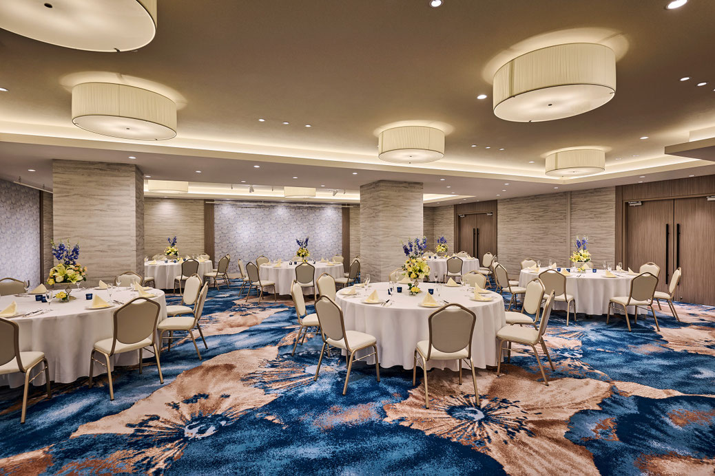 京成ホテルミラマーレでは700名まで収容可能な大宴会場が1つ、45名から120名まで収容可能な中宴会場が3つ、35名まで収容可能な小宴会場が3つ用意されています。これらに加えて200名まで収容可能なスカイバンケット、8名まで収容可能な和室が2室あります。大宴会場は天井の高さが7.2mある解放感のある空間で、最大で3分割での利用も可能です。